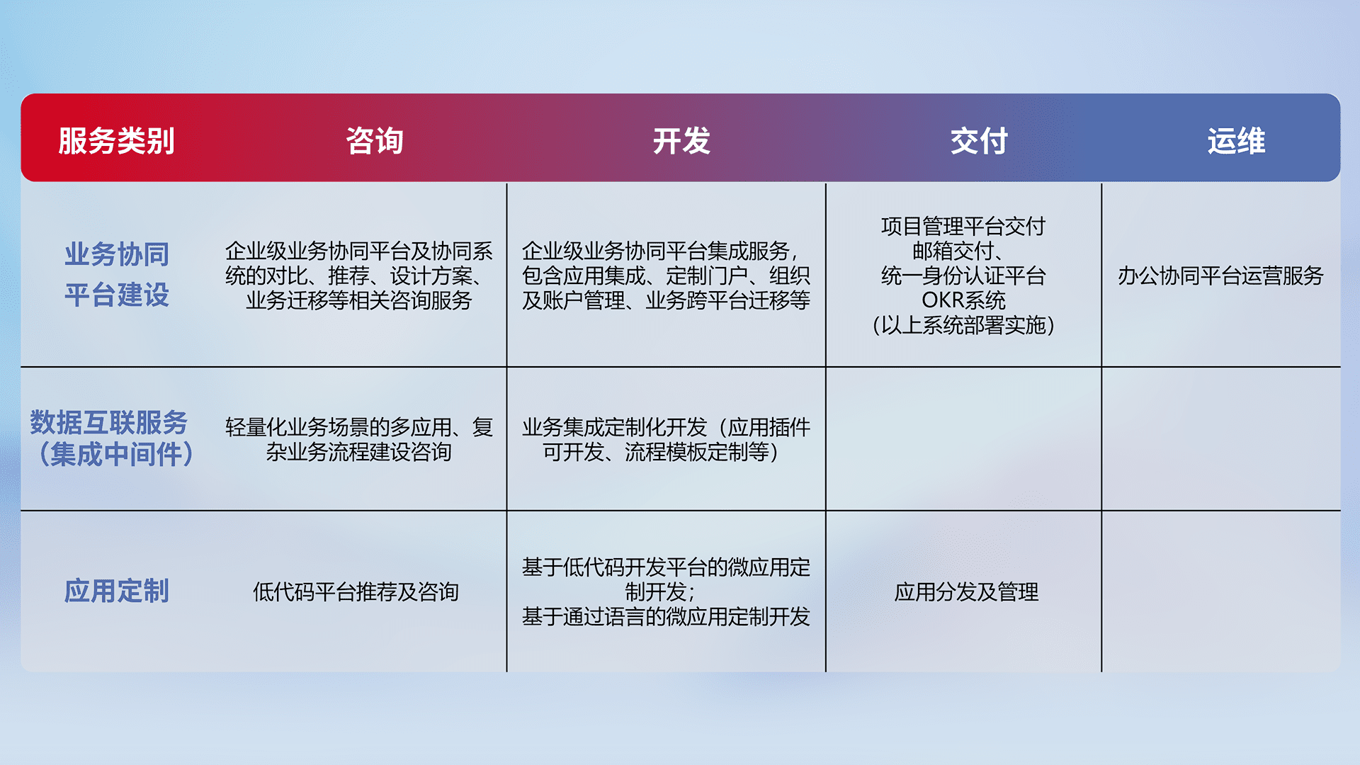 针对钉钉、、企微、、、、IDaas等平台级产品提供产品的规划、、方案、、交付、、定制化开发等服务,,实现如统一协同办公、、、、智能客户服务、、混合会议管理、、、、智能数据查询、、等业务场景,,,实现数字化转型。。。。