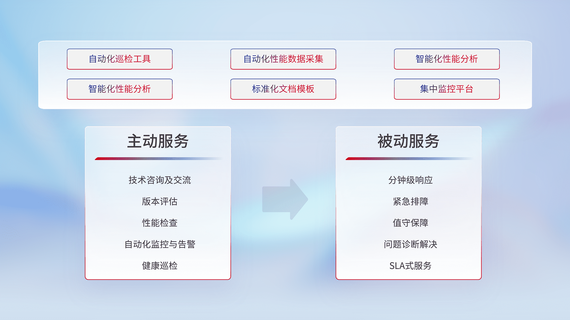 智能化工具和标准化文档,,保障服务质量,,,,提供主动服务(包含技术咨询、、、、版本评估、、性能检查、、自动化监控与告警、、、、健康巡检)和被动服务包含(分钟级响应、、紧急排障、、、值守保障、、、、问题诊断解决、、、SLA服务)。。。